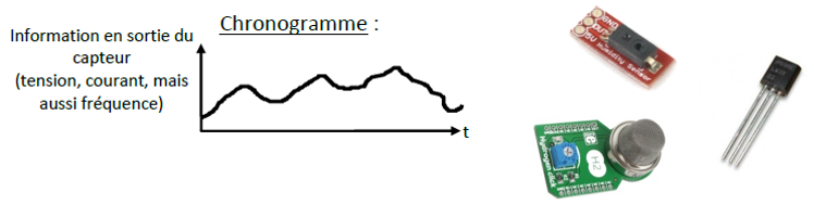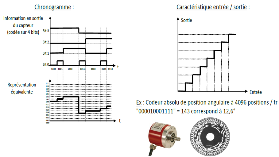 Ce type de capteur délivre en sortie une information électrique à caractère numérique, c’est-à-dire ne pouvant prendre qu’un nombre de valeurs. Le signal varie de façon discontinue au cours du temps. L’information délivrée par ces capteurs est un code numérique sur plusieurs bits.