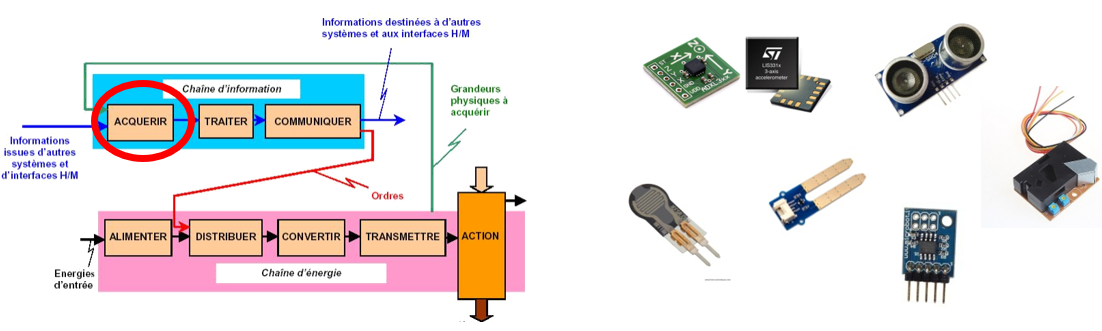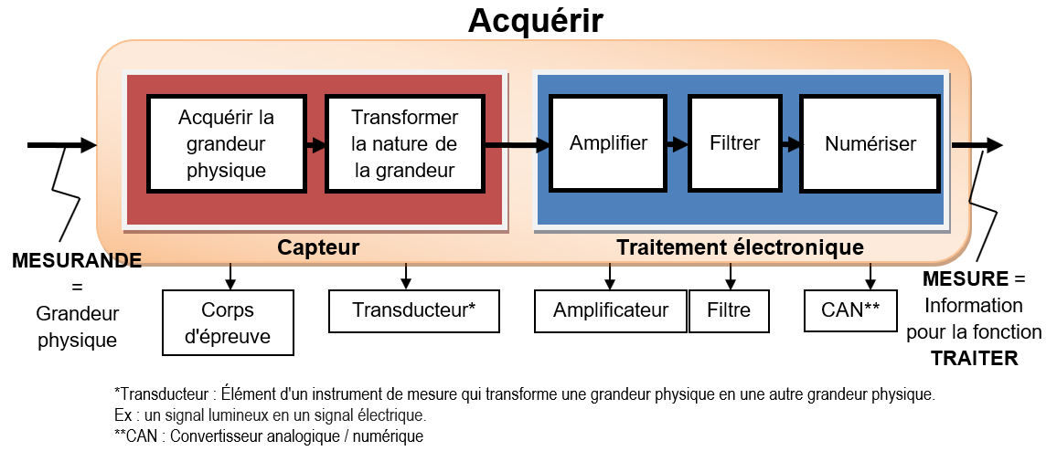 Un capteur permet de convertir une grandeur physique (mesurande) en un signal électrique. Ceci permettra un traitement du signal électrique par des structures électroniques à des fins de mesures et/ou de commandes.