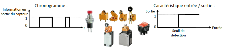 logique : deux valeurs possibles , aussi désigné tout ou rien (TOR), logique ou binaire. On parle alors de détecteurs qui sont utilisés dans les automatismes séquentiels. Les plus triviaux étant les interrupteurs et boutons-poussoirs