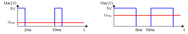 Calculez les rapports cycliques des 2 signaux électriques ci-dessous, puis la valeur moyenne Umoy lorsque Umax = 5V :