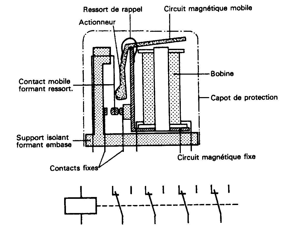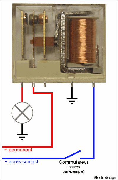 En alimentant la bobine, le contact mobile est déplacé fermant ainsi le contact électrique. En l’absence de courant dans la bobine le ressort de rappel maintient le contact ouvert.