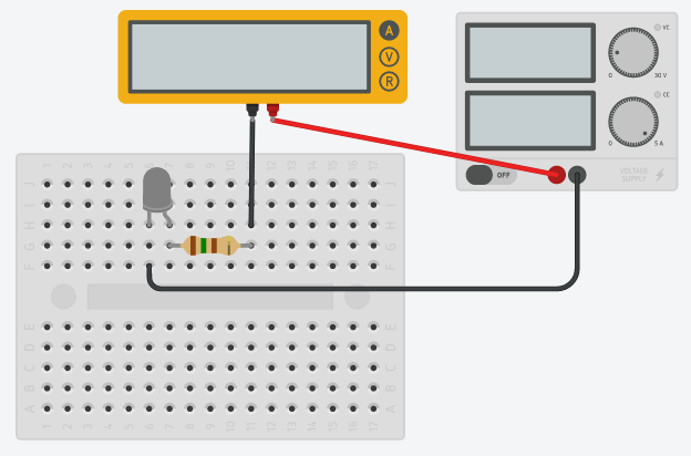 Câbler les composants et l'ampèremètre tels qu'ils sont représentés ci-dessus sur la "breadboard" du Raspberry pi.