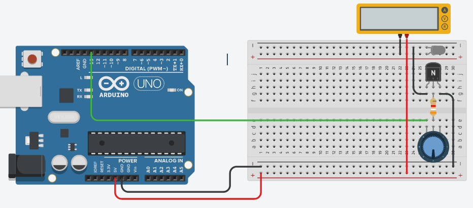 En vous inspirant du montage amplificateur de courant à transistor, simuler un circuit électrique similaire, afin qu'un Arduino puisse commander la résistance chauffante alimentée sous 12V.