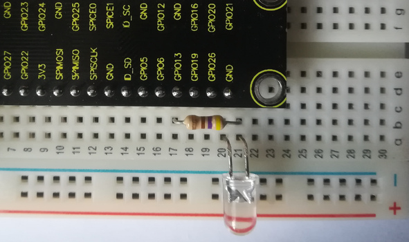 Avant d'alimenter le Raspberry pi, brancher la LED et une résistance de 470 Ω sur la "breadboard", comme le montre la photo suivante