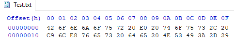 Le contenu du fichier text.txt, représenté ci-dessous, commence à partir de l'adresse 00000000 avec la donnée 0x42 et contient 32 caractères ASCII.