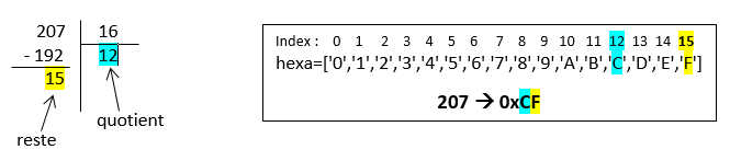 Pour convertir l'entier décimal 207 en hexadécimal, on procède comme suit :