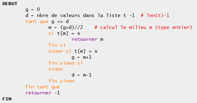 Fonction recherche_dichotomique d'une valeur dans une liste triée Retourne la position de la valeur dans la liste ou -1 si elle n'y est pas paramètres : t : liste x : entier à rechercher Résultat : retourne un entier qui correspond à la position de x dans la liste t début de la fonction définir la variable g à 0 d est égal à l'indice du dernier élément de la liste t tant que g ≤ d m ← (g+d)÷2 on calcule l'indice du mileu, ATTENTION m doit être un entier si t[m] = x retourner m sinon si t[m] < x g ← m+1 sinon d ← m-1 retourner -1 fin de la fonction