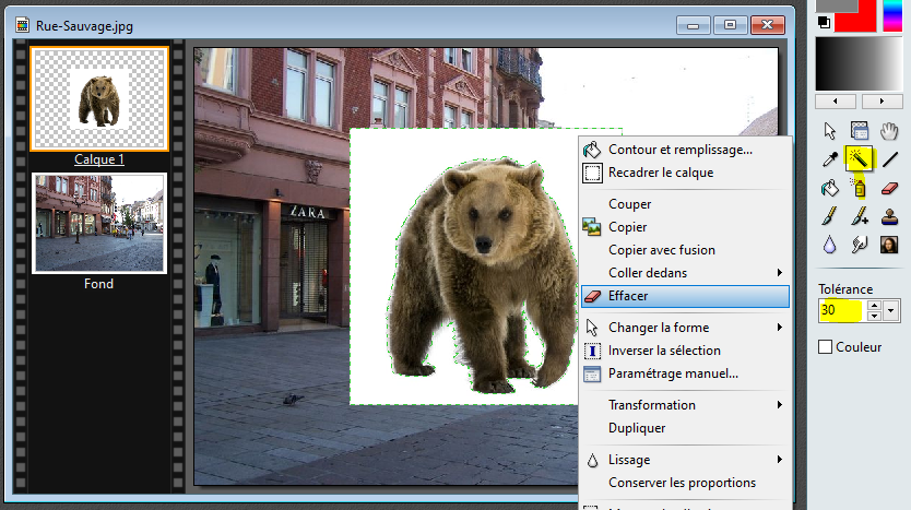 Pour supprimer le fond blanc, cliquez sur la baguette magique et régler la Tolérance, puis cliquez sur le fond blanc de l'ours, puis effacer.