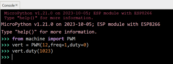 vert = PWM(12, freq=1, duty=0) crée un objet vert de type PWM sur la broche n° 12 de fréquence 1Hz et de rapport cyclique 0.