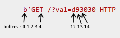 En langage python, pour extraire une cous chaîne de caractère : si requete="b'GET /?val=d930FF HTTP ..." alors requete[12:14] retournera la sous chaine "d9