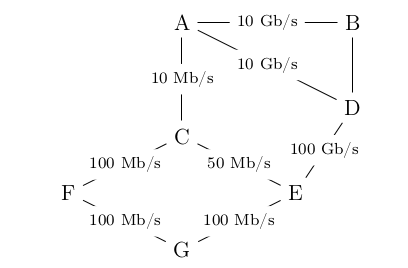 On a rajouté sur le graphe représentant le réseau précédent les différents débits des liaisons.