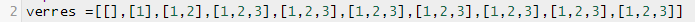 verres=[[],[1],[1,2],[1,2,3],[1,2,3],...]Afin que le verre 1 corresponde bien à son indice on peut commencer par un élément de rang 0 vide, cela évitera de retrancher 1 à l'indice.