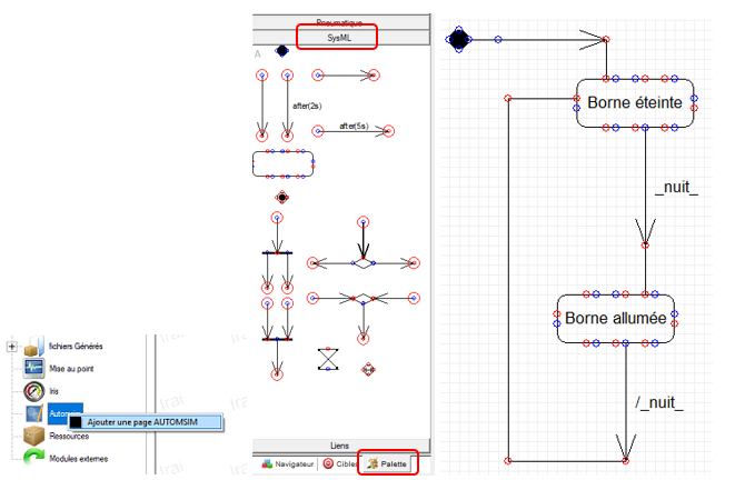 Ajouter une page AUTOMSIM puis cliquer sur Palette et sélectionner SysML et dessiner le diagramme