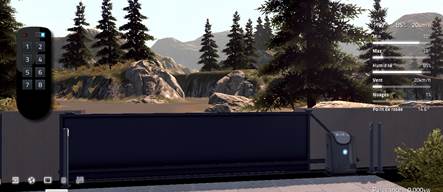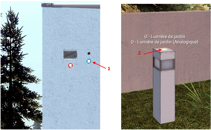 Exécuter Home I/O puis déplacez-vous devant le garage pour cliquer sur les icones rouges du détecteur crépusculaire et de la borne pour les faire passer en bleu.