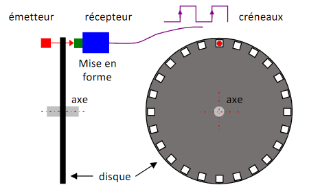 Remarque : Le nombre d'impulsions générées chaque seconde, correspond aussi à la fréquence en Hertz du signal électrique généré par le codeur.
