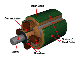 Le moteur à courant continu possède un collecteur pour alimenter les bobines afin de créer un champ électromagnétique dans le rotor qui sera mis en rotation, attiré par l'aimant permanant ou électromagnétique du stator. La mise en rotation est assurée par le collecteur qui va alimenter la bobine suivante. Une inversion de polarité permettra au moteur d'inverser le sens de rotation.